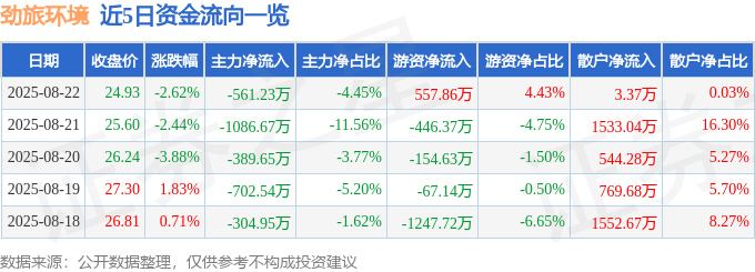 证券之星消息,截至2025年8月22日收盘,劲旅环境(001230)报收于24.93元,下跌2.62%,换手率9.3%,成交量5.03万手,成交额1.26亿元。
