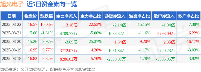 证券之星消息,旭光电子8月22日涨停收盘,收盘价16.57元。该股于10点51分涨停,2次打开涨停,截止收盘封单资金为4455.47万元,占其流通市值0.32%。