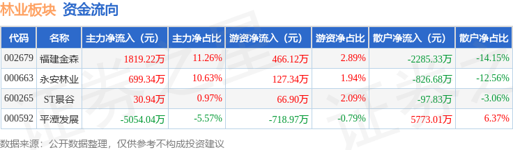 从资金流向上来看,当日林业板块主力资金净流出2504.54万元,游资资金净流出58.61万元,散户资金净流入2563.16万元。林业板块个股资金流向见下表: