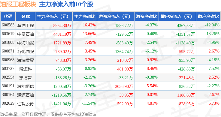 从资金流向上来看,当日油服工程板块主力资金净流出1123.19万元,游资资金净流出1550.67万元,散户资金净流入2673.86万元。油服工程板块个股资金流向见下表: