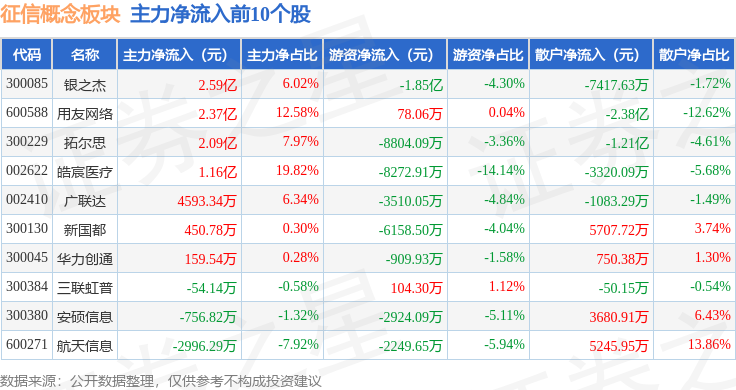 从资金流向上来看,当日征信概念板块主力资金净流入5.67亿元,游资资金净流出4.98亿元,散户资金净流出6879.68万元。征信概念板块个股资金流向见下表: