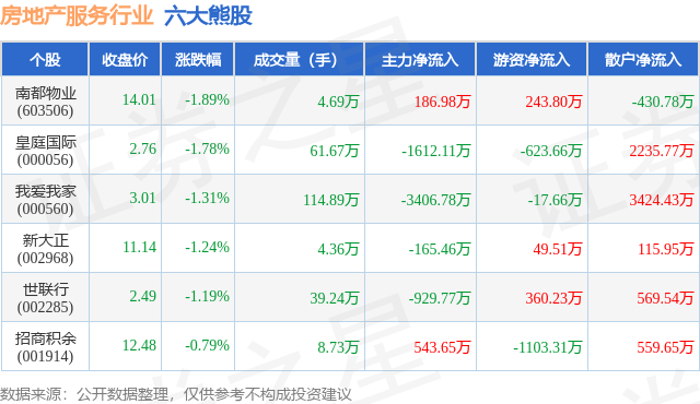 个股表现方面,房地产服务行业当日领跌股为南都物业(603506),该股当日报收14.01,下跌1.89%,成交量4.69万,主力资金净流入186.98万元。皇庭国际(000056)以下跌1.78%紧随其后,该股当日成交量61.67万,主力资金净流出1612.11万元。除此之外,我爱我家(000560)、新大正(002968)、世联行(002285)均进入当日熊股之列。具体个股列表见下表: