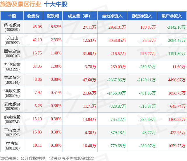 个股表现方面,旅游及景区行业当日领涨股为西域旅游(300859),该股当日报收45.08,上涨8.52%,成交量27.11万,主力资金净流入2961.31万元。长白山(603099)以上涨2.33%紧随其后,该股当日成交量12.53万,主力资金净流入3058.85万元。除此之外,西安旅游(000610)、九华旅游(603199)、宋城演艺(300144)均进入当日牛股之列。具体个股列表见下表:
