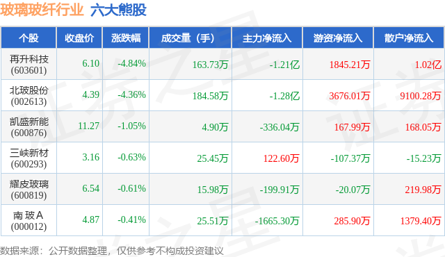 个股表现方面,玻璃玻纤行业当日领跌股为再升科技(603601),该股当日报收6.1,下跌4.84%,成交量163.73万,主力资金净流出1.21亿元。北玻股份(002613)以下跌4.36%紧随其后,该股当日成交量184.58万,主力资金净流出1.28亿元。除此之外,凯盛新能(600876)、三峡新材(600293)、耀皮玻璃(600819)均进入当日熊股之列。具体个股列表见下表: