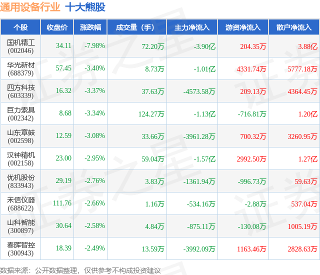 个股表现方面,通用设备行业当日领跌股为国机精工(002046),该股当日报收34.11,下跌7.98%,成交量72.2万,主力资金净流出3.9亿元。华光新材(688379)以下跌3.4%紧随其后,该股当日成交量8.73万,主力资金净流出1.01亿元。除此之外,四方科技(603339)、巨力索具(002342)、山东章鼓(002598)均进入当日熊股之列。具体个股列表见下表: