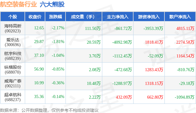 个股表现方面,航空装备行业当日领跌股为海特高新(002023),该股当日报收12.65,下跌2.17%,成交量111.5万,主力资金净流出861.72万元。爱乐达(300696)以下跌1.81%紧随其后,该股当日成交量20.59万,主力资金净流出4092.98万元。除此之外,航宇科技(688239)、纵横股份(688070)、威海广泰(002111)均进入当日熊股之列。具体个股列表见下表: