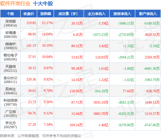 个股表现方面,软件开发行业当日领涨股为深信服(300454),该股当日报收119.85,上涨15.17%,成交量20.15万,主力资金净流入1.19亿元。安博通(688168)以上涨14.04%紧随其后,该股当日成交量6.45万,主力资金净流出1073.23万元。除此之外,指南针(300803)、概伦电子(688206)、天融信(002212)均进入当日牛股之列。具体个股列表见下表: