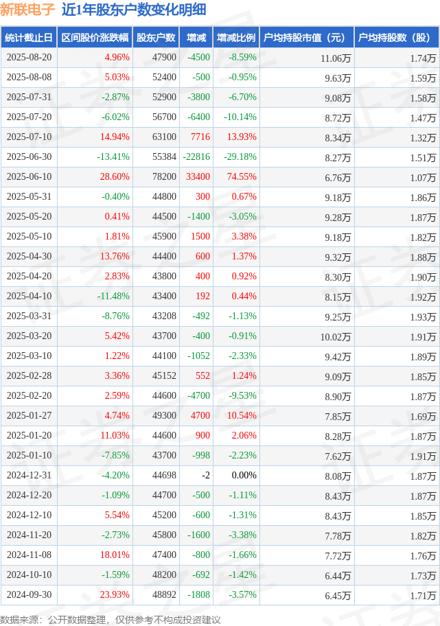 从股价来看,2025年8月8日至2025年8月20日,新联电子区间涨幅为4.96%,在此期间股东户数减少4500.0户,减幅为8.59%。
