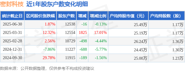 从股价来看,2025年3月31日至2025年6月30日,密封科技区间涨幅为1.87%,在此期间股东户数减少16.0户,减幅为0.13%。