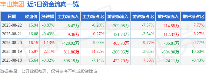 证券之星消息,截至2025年8月22日收盘,丰山集团(603810)报收于15.94元,下跌0.87%,换手率1.05%,成交量1.73万手,成交额2762.49万元。