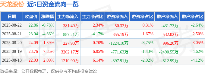 证券之星消息,截至2025年8月22日收盘,天龙股份(603266)报收于22.86元,下跌0.78%,换手率3.56%,成交量7.08万手,成交额1.63亿元。