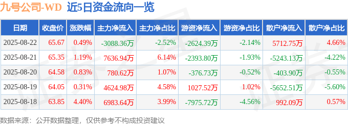 证券之星消息,截至2025年8月22日收盘,九号公司(689009)报收于65.67元,上涨0.49%,换手率3.35%,成交量18.63万手,成交额12.25亿元。