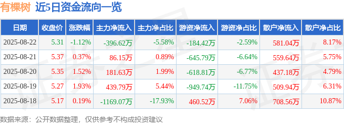 证券之星消息,截至2025年8月22日收盘,有棵树(300209)报收于5.31元,下跌1.12%,换手率2.74%,成交量13.42万手,成交额7111.73万元。
