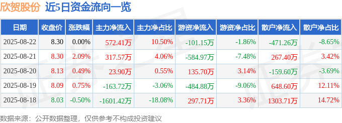 证券之星消息,截至2025年8月22日收盘,欣贺股份(003016)报收于8.3元,上涨0.0%,换手率1.58%,成交量6.61万手,成交额5449.94万元。