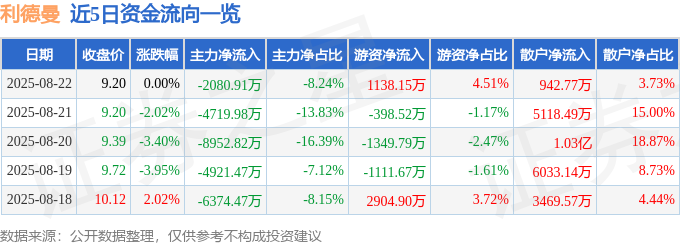 8月22日的资金流向数据方面,主力资金净流出2080.91万元,占总成交额8.24%,游资资金净流入1138.15万元,占总成交额4.51%,散户资金净流入942.77万元,占总成交额3.73%。