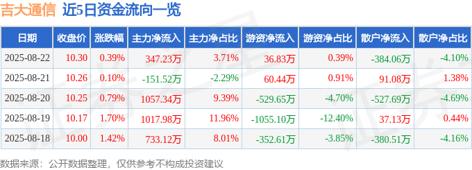 8月22日的资金流向数据方面,主力资金净流入347.23万元,占总成交额3.71%,游资资金净流入36.83万元,占总成交额0.39%,散户资金净流出384.06万元,占总成交额4.1%。