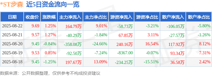 证券之星消息,截至2025年8月22日收盘,*ST步森(002569)报收于9.69元,上涨1.25%,换手率1.35%,成交量1.9万手,成交额1828.29万元。