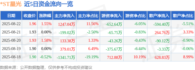 证券之星消息,截至2025年8月22日收盘,*ST星光(002076)报收于1.96元,上涨1.55%,换手率5.35%,成交量55.06万手,成交额1.08亿元。