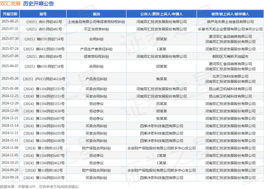 案号:(2025)吉01民初483号根据统计,近一年内以河南双汇投资发展股份有限公司为当事人的历史开庭公告有23则,其中案由为“买卖合同纠纷”的公告以8则居首,其次为“劳动争议”有6则,“合同纠纷”有2则。历史开庭公告(前20条)如下: