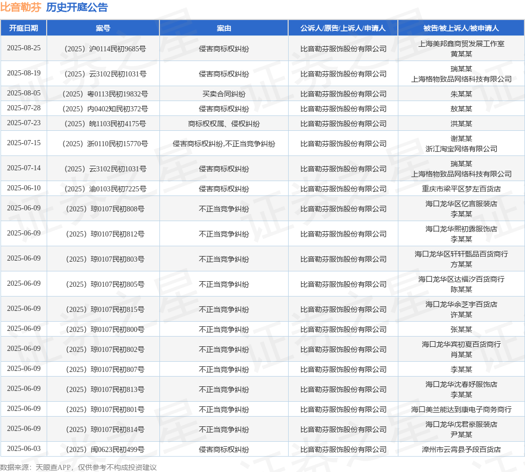 案号:(2025)沪0114民初9685号根据统计,近一年内以比音勒芬服饰股份有限公司为当事人的历史开庭公告有71则,其中案由为“侵害商标权纠纷”的公告以38则居首,其次为“不正当竞争纠纷”有13则,“商标权权属、侵权纠纷”有8则。历史开庭公告(前20条)如下: