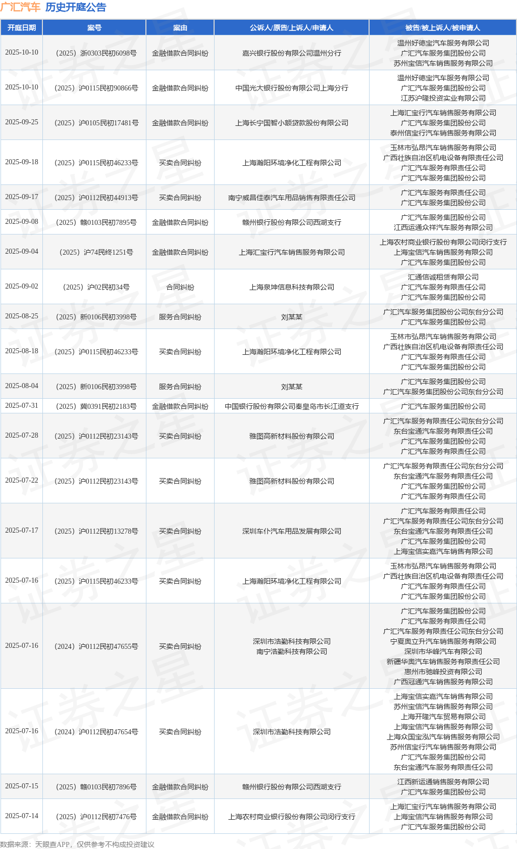 案号:(2025)新0106民初3998号根据统计,近一年内以广汇汽车服务集团股份公司为当事人的历史开庭公告有76则,其中案由为“买卖合同纠纷”的公告以28则居首,其次为“金融借款合同纠纷”有25则,“证券虚假陈述责任纠纷”有11则。历史开庭公告(前20条)如下: