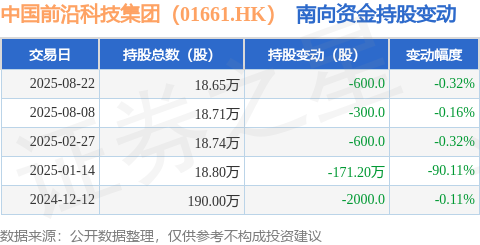证券之星消息,8月22日南向资金减持600.0股中国前沿科技集团(01661.HK)。近5个交易日中,获南向资金减持的有5天,累计净减持171.55万股。近20个交易日中,获南向资金减持的有20天,累计净减持1.54亿股。截至目前,南向资金持有中国前沿科技集团(01661.HK)18.65万股,占公司已发行普通股的0.09%。