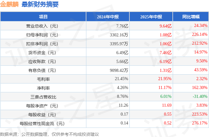 据证券之星公开数据整理,近期金麒麟(603586)发布2025年中报。截至本报告期末,公司营业总收入9.64亿元,同比上升24.34%,归母净利润1.08亿元,同比上升226.14%。按单季度数据看,第二季度营业总收入4.44亿元,同比上升10.97%,第二季度归母净利润3263.23万元,同比上升108.16%。本报告期金麒麟盈利能力上升,毛利率同比增幅2.32%,净利率同比增幅162.3%。