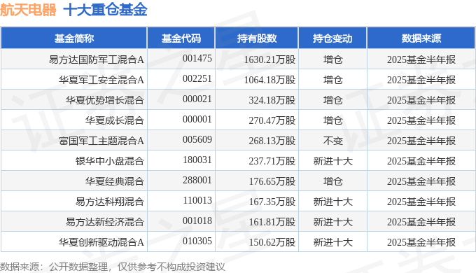 持有航天电器最多的基金为易方达国防军工混合A,目前规模为88.02亿元,最新净值1.563(8月22日),较上一交易日上涨1.76%,近一年上涨39.26%。该基金现任基金经理为何崇恺。