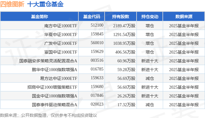持有四维图新最多的基金为南方中证1000ETF,目前规模为649.53亿元,最新净值2.9759(8月22日),较上一交易日上涨1.52%,近一年上涨61.16%。该基金现任基金经理为崔蕾。