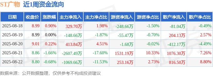 资金流向数据方面,本周ST广物主力资金合计净流出3082.26万元,游资资金合计净流入1478.54万元,散户资金合计净流入1603.72万元。本周资金流向一览见下表: