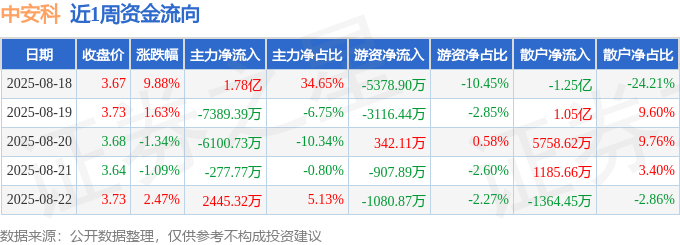资金流向数据方面,本周中安科主力资金合计净流入6519.29万元,游资资金合计净流出1.01亿元,散户资金合计净流入3622.7万元。本周资金流向一览见下表: