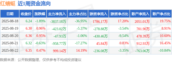 资金流向数据方面,本周红蜻蜓主力资金合计净流出4267.76万元,游资资金合计净流入886.59万元,散户资金合计净流入3381.17万元。本周资金流向一览见下表: