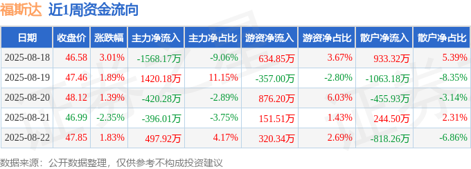 资金流向数据方面,本周福斯达主力资金合计净流出466.36万元,游资资金合计净流入1625.9万元,散户资金合计净流出1159.55万元。本周资金流向一览见下表: