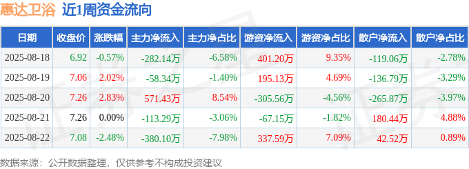 资金流向数据方面,本周惠达卫浴主力资金合计净流出262.44万元,游资资金合计净流入561.2万元,散户资金合计净流出298.77万元。本周资金流向一览见下表: