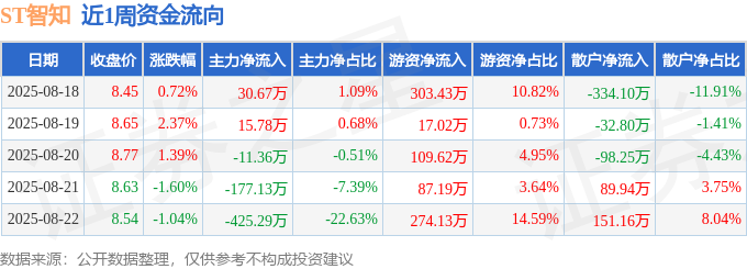 资金流向数据方面,本周ST智知主力资金合计净流出567.33万元,游资资金合计净流入791.4万元,散户资金合计净流出224.07万元。本周资金流向一览见下表: