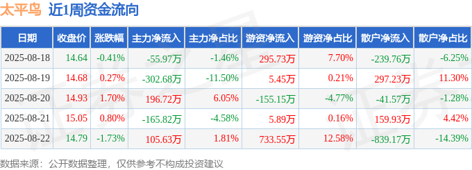 资金流向数据方面,本周太平鸟主力资金合计净流出222.12万元,游资资金合计净流入885.47万元,散户资金合计净流出663.35万元。本周资金流向一览见下表:
