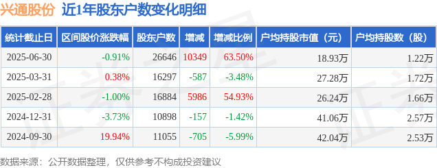 从股价来看,2025年3月31日至2025年6月30日,兴通股份区间跌幅为0.91%,在此期间股东户数增加1.03万户,增幅为63.5%。