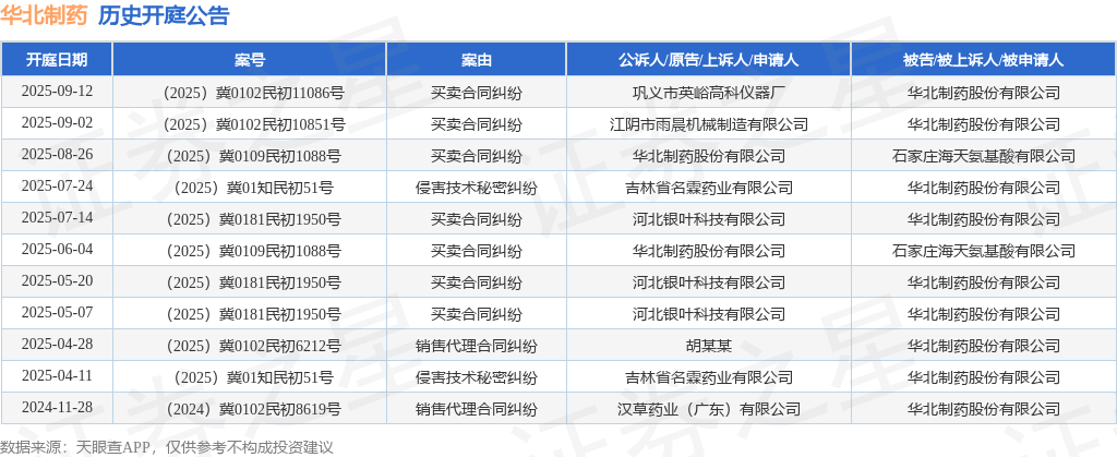 案号:(2025)冀0109民初1088号根据统计,近一年内以华北制药股份有限公司为当事人的历史开庭公告有11则,其中案由为“买卖合同纠纷”的公告以7则居首,其次为“侵害技术秘密纠纷”有2则,“销售代理合同纠纷”有2则。历史开庭公告如下:
