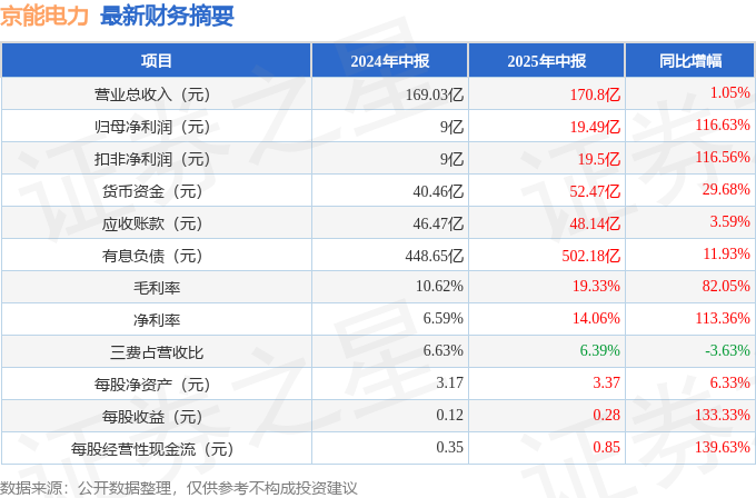 据证券之星公开数据整理,近期京能电力(600578)发布2025年中报。截至本报告期末,公司营业总收入170.8亿元,同比上升1.05%,归母净利润19.49亿元,同比上升116.63%。按单季度数据看,第二季度营业总收入71.95亿元,同比下降3.44%,第二季度归母净利润8.86亿元,同比上升102.65%。本报告期京能电力盈利能力上升,毛利率同比增幅79.87%,净利率同比增幅100.46%。