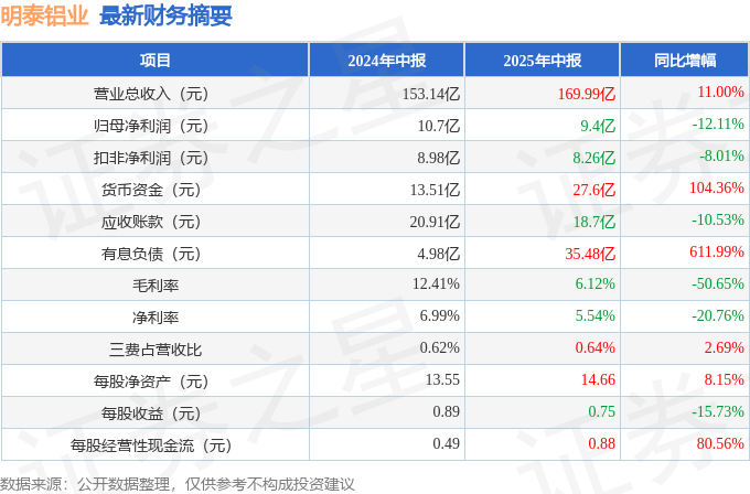 据证券之星公开数据整理,近期明泰铝业(601677)发布2025年中报。截至本报告期末,公司营业总收入169.99亿元,同比上升11.0%,归母净利润9.4亿元,同比下降12.11%。按单季度数据看,第二季度营业总收入88.75亿元,同比上升9.18%,第二季度归母净利润5.01亿元,同比下降29.28%。本报告期明泰铝业公司应收账款体量较大,当期应收账款占最新年报归母净利润比达106.97%。