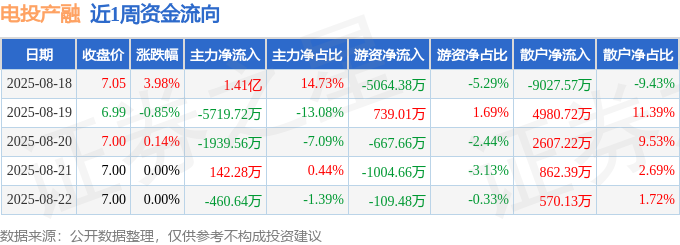 资金流向数据方面,本周电投产融主力资金合计净流入6114.29万元,游资资金合计净流出6107.17万元,散户资金合计净流出7.12万元。本周资金流向一览见下表: