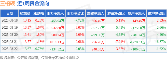 资金流向数据方面,本周三柏硕主力资金合计净流入1536.79万元,游资资金合计净流入646.95万元,散户资金合计净流出2183.74万元。本周资金流向一览见下表: