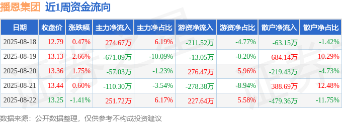 资金流向数据方面,本周播恩集团主力资金合计净流出312.04万元,游资资金合计净流入1.16万元,散户资金合计净流入310.88万元。本周资金流向一览见下表: