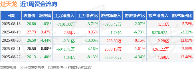 资金流向数据方面,本周楚天龙主力资金合计净流出2.19亿元,游资资金合计净流出2.39亿元,散户资金合计净流入4.58亿元。本周资金流向一览见下表: