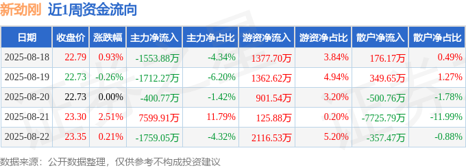 资金流向数据方面,本周新劲刚主力资金合计净流入2173.94万元,游资资金合计净流入5884.26万元,散户资金合计净流出8058.2万元。本周资金流向一览见下表: