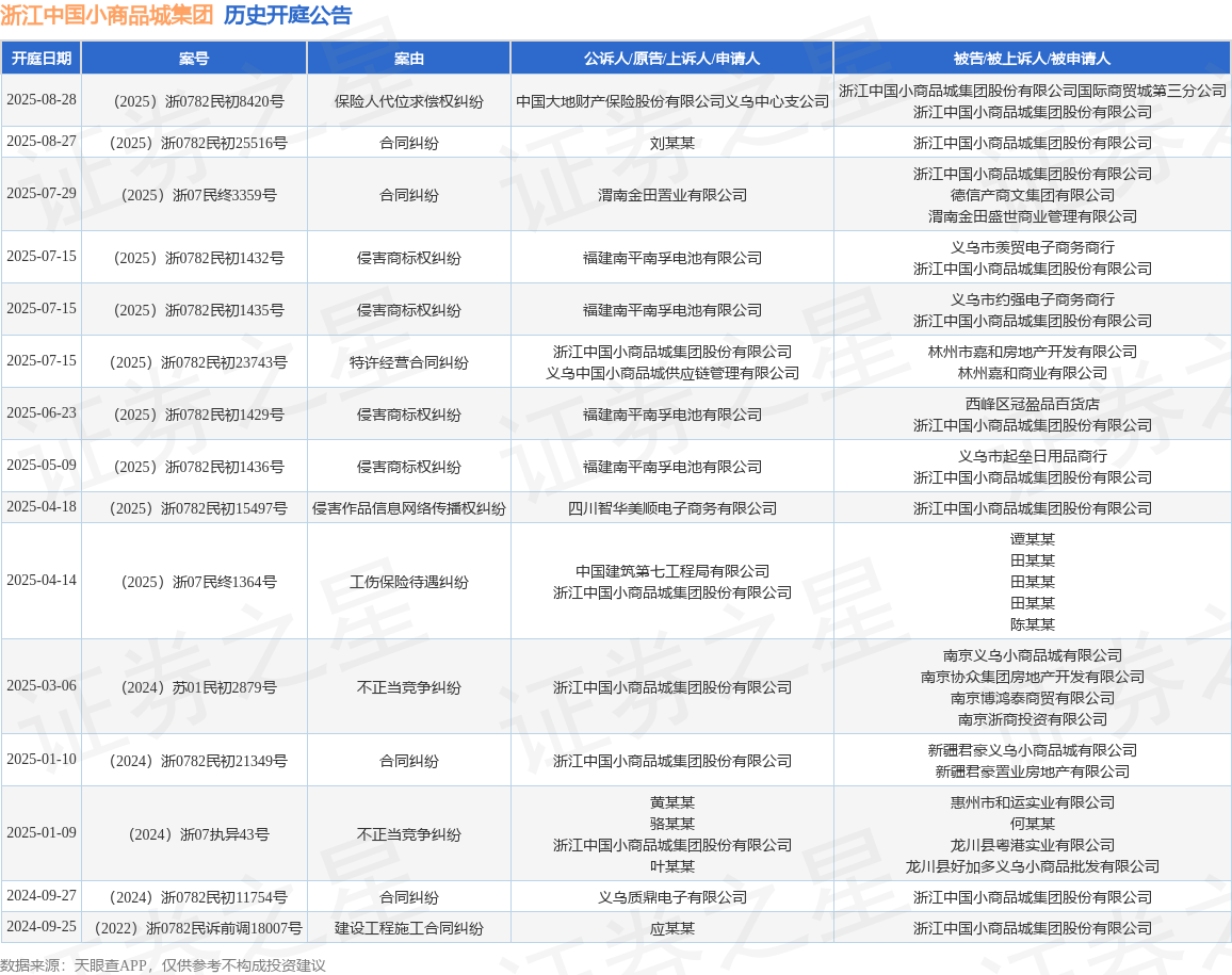 案号:(2025)浙0782民初25516号根据统计,近一年内以浙江中国小商品城集团股份有限公司为当事人的历史开庭公告有15则,其中案由为“侵害商标权纠纷”的公告以4则居首,其次为“合同纠纷”有4则,“不正当竞争纠纷”有2则。历史开庭公告如下: