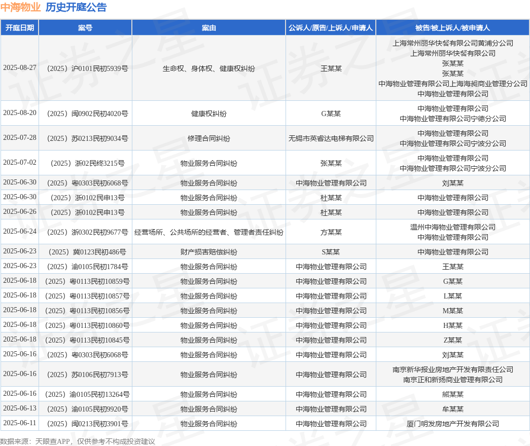 证券之星消息,根据天眼查APP显示,近日公布了一则中海物业管理有限公司作为被告/被上诉人的开庭公告,详细内容如下: