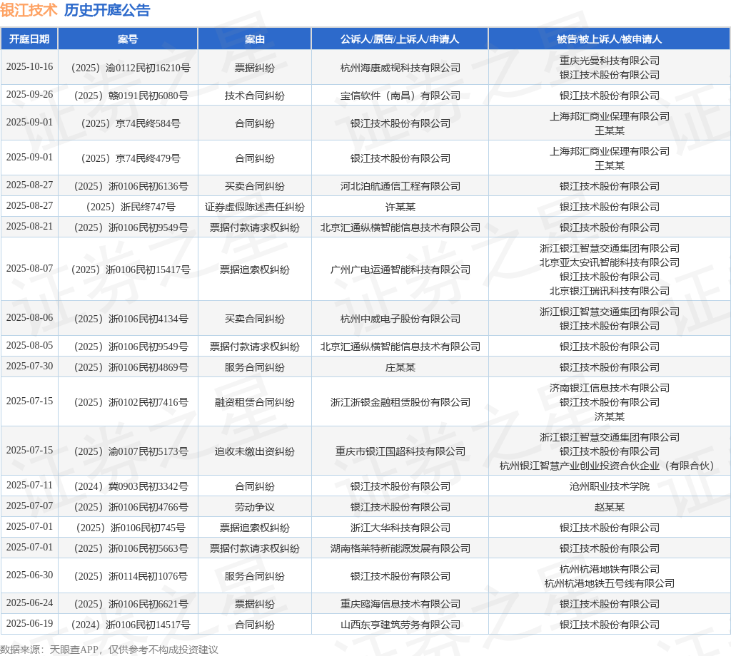 案号:(2025)浙民终747号根据统计,近一年内以银江技术股份有限公司为当事人的历史开庭公告有104则,其中案由为“劳动争议”的公告以14则居首,其次为“票据追索权纠纷”有12则,“合同纠纷”有12则。历史开庭公告(前20条)如下: