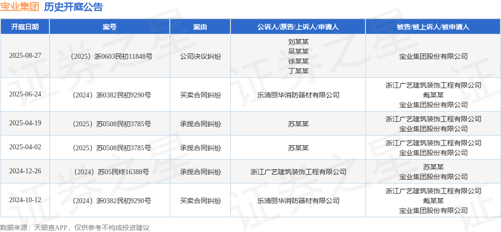 根据统计,近一年内以宝业集团股份有限公司为当事人的历史开庭公告有6则,其中案由为“承揽合同纠纷”的公告以3则居首,其次为“买卖合同纠纷”有2则,“公司决议纠纷”有1则。历史开庭公告如下: