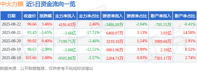 证券之星消息,截至2025年8月22日收盘,中大力德(002896)报收于96.66元,上涨3.46%,换手率9.05%,成交量17.78万手,成交额17.05亿元。